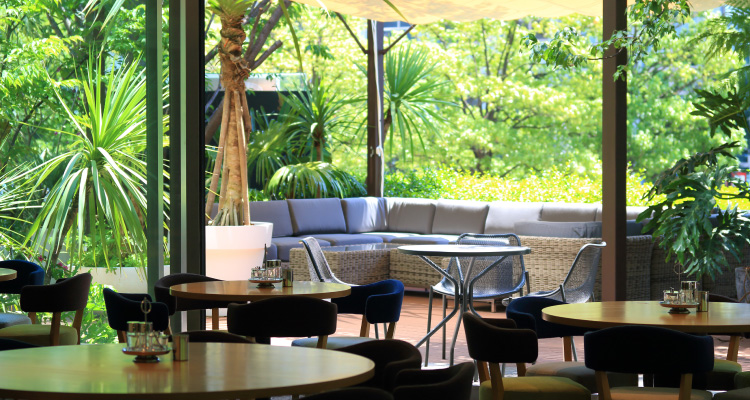 まるでシンガポールのガーデンリゾート。光と緑に包まれた店内とウッドデッキテラスは、都会の真ん中とは思えない心地よさです。